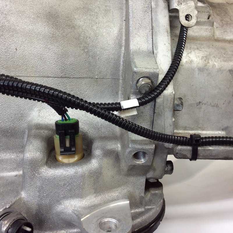 Use one of the provided cable ties to fasten the harness to the bellhousing as shown: