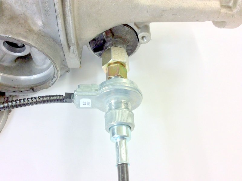 Screw the speed sensor into the speedometer drive on the tailhousing, being sure to engage the short cable inside the drive.