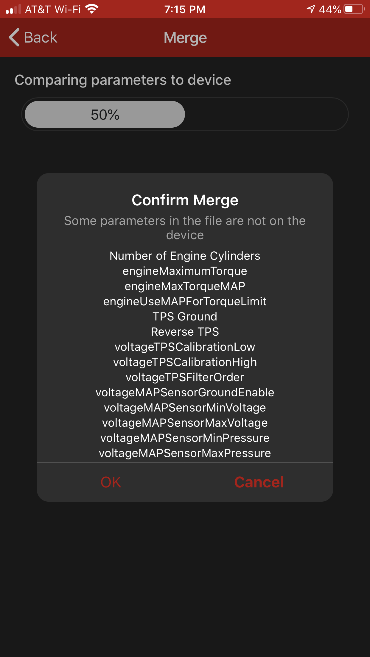 You will get a notice that warns you that the engine or transmission type do not match, and warn you of the consequences of loading parameters that don’t match the previous system. In this case here, we know that the change is safe, so we click “OK”.