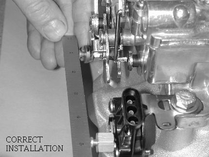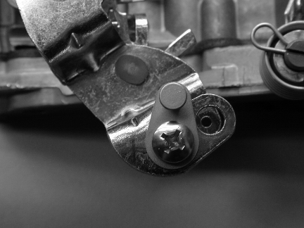 Install the ratio arm onto the carburetor linkage using the ΒΌ-20 x 5/8 pan-head Phillips screw, washer, and nylon insert lock nut as shown above. The ratio arm is designed to mount in the linkage where a kick-down cable would normally attach. The washer sits between the carburetor linkage and the nylon insert nut as shown on the opposing page. Gently snug the screw and nut, but do not completely tighten.