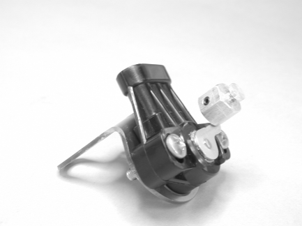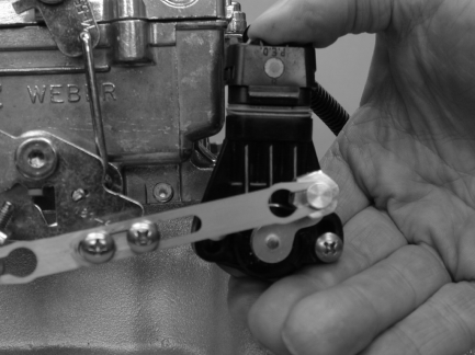 Attach the adjustable arm by rotating the throttle position sensor so that its pin can be inserted into the adjustable arm. The picture above shows the arm in its fully installed position.