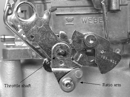 For the Rochester Quadrajet, set the ratio arm angle so that the ratio arm pin is vertical as shown in the picture above. Tighten the screw and nut in this position.