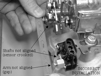The sensor must be aligned correctly. The rotation of the throttle linkage should match the rotation of the throttle position sensor. The ratio arm needs to be aligned along a straight line with the throttle position sensor (think of the motion of louvers on a window shade). A straight edge or ruler can be used as shown to assist with alignment.
