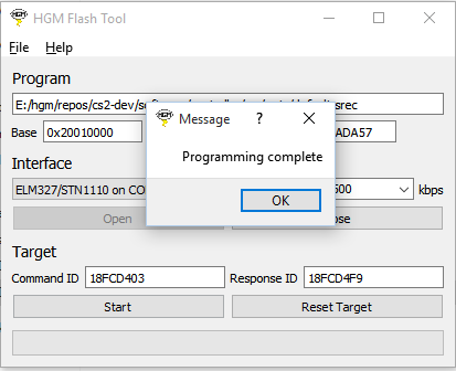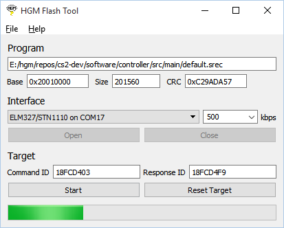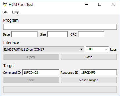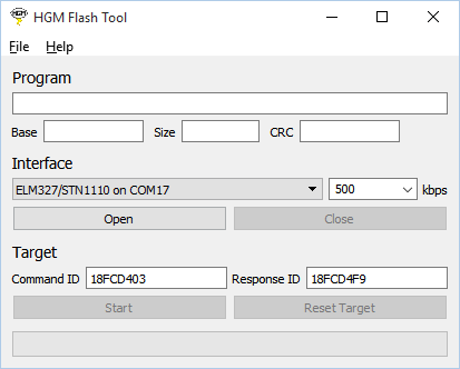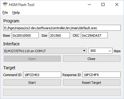 Now, use the file menu to select a programming file (which usually ends with an ".srec" file extension). After you have selected a file, the HGMFlash tool will show the filename and some data about the program to be flashed.