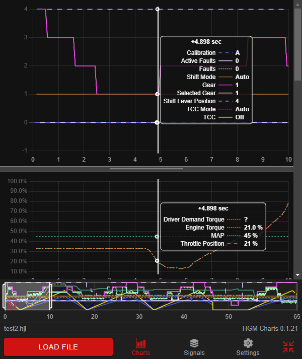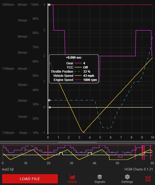 If you are on a desktop platform, you can drag and drop a log file onto the window. On all devices, you can click or tap the LOAD FILE button and then browse on your local device for an HGM log file (has extension .hjl).