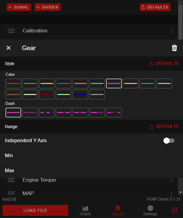 You can access more options for signal display by clicking or tapping the signal. To set the color and dash pattern of the line on the chart, click or tap the button showing how you want it to look. Enabling the “Independent Y Axis” option will cause the signal to be shown with its own separate Y axis, even if there are other signals in the same chart with the same type. The Min and Max options can be used to change the range of the Y axis.