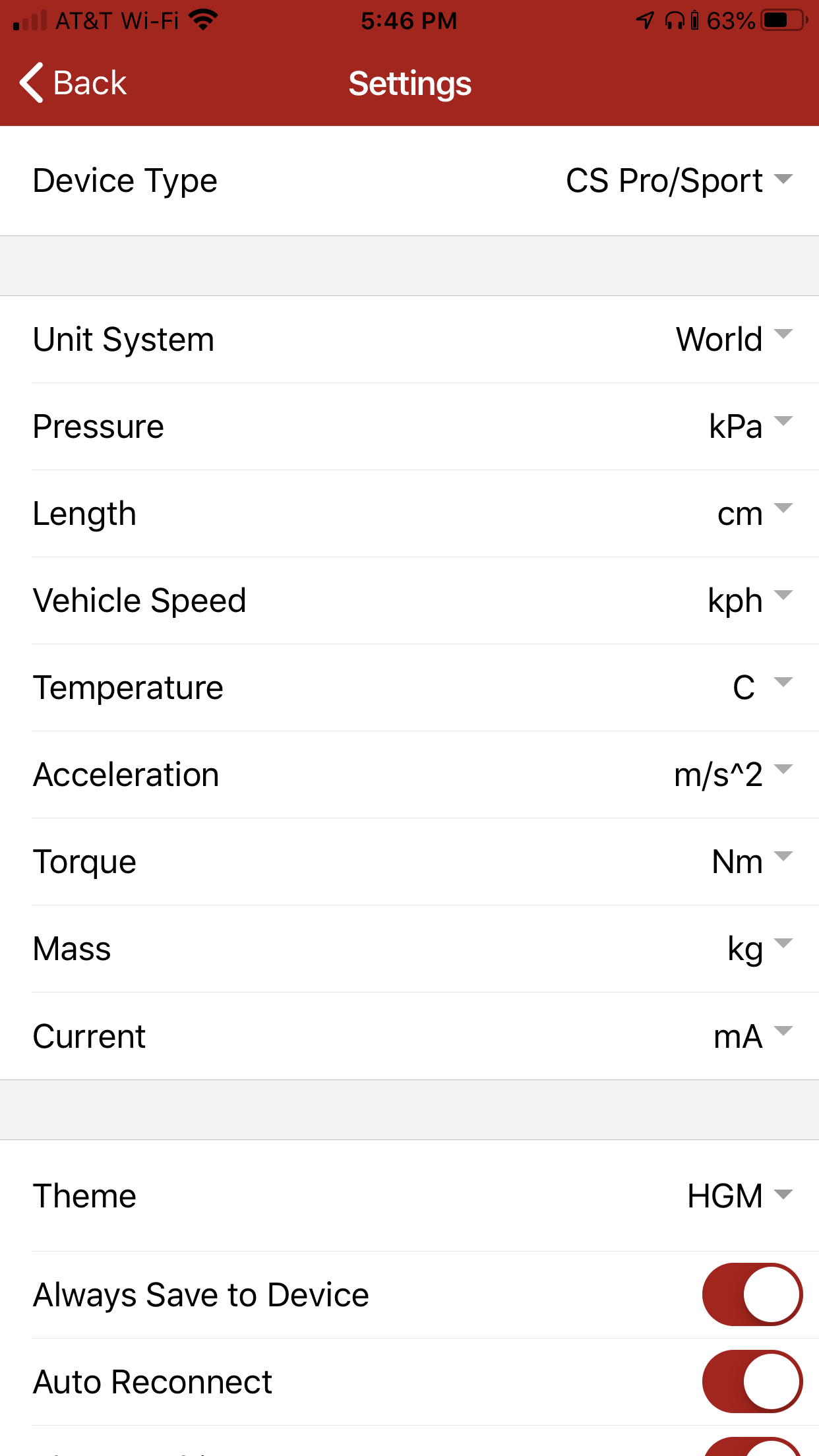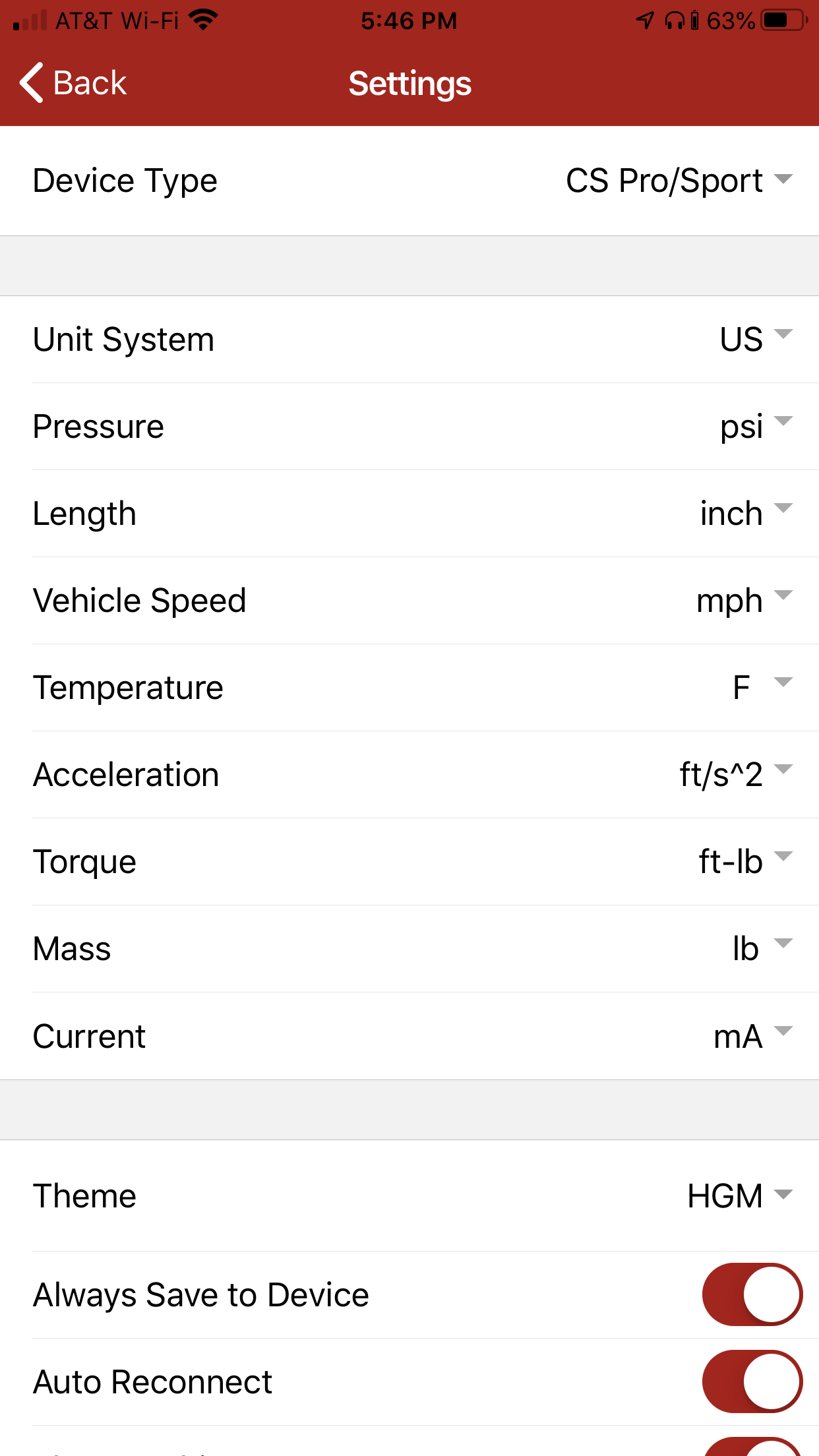 The CS Setup app has unit settings that are help of the app itself, not in the COMPUSHIFT controller. The COMPUSHIFT controller always uses metric units internally and communicates to the app using metric units as well. The app, in turn, translates units if needed before displaying them. The app will always use the unit system settings you have selected, regardless of which COMPUSHIFT controller you connect to.