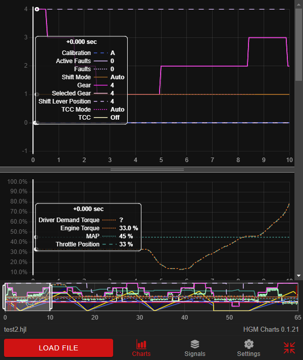 One the file is loaded, you will see the resulting charts, and you can use the scroll bar on the left side to move up and down among the charts. By default, one chart is created for each signal type which minimizes the number of Y axes on the left side.