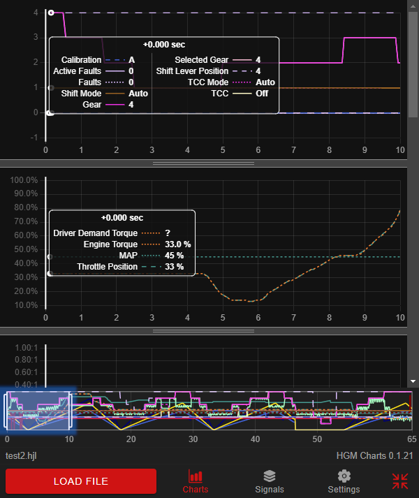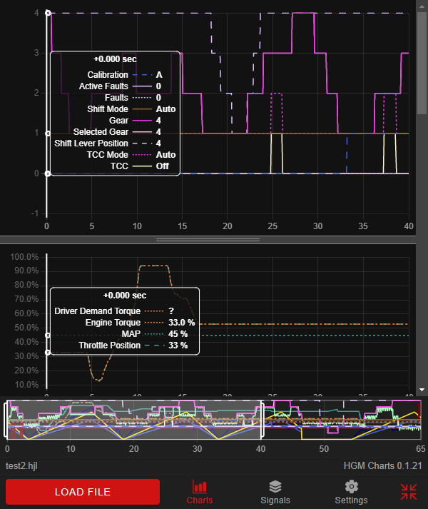 If you are on a desktop platform, you can drag and drop a log file onto the window. On all devices, you can click or tap the LOAD FILE button and then browse on your local device for an HGM log file (has extension .hjl).