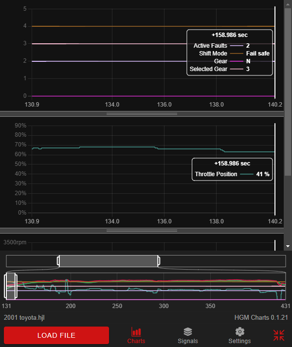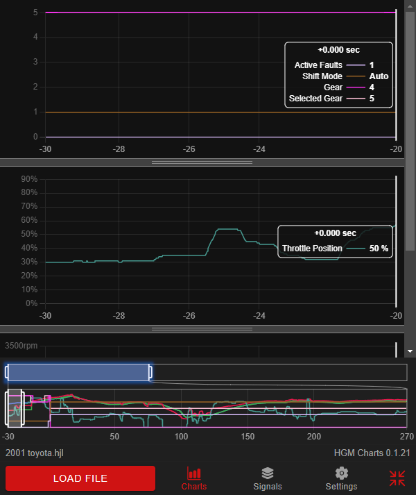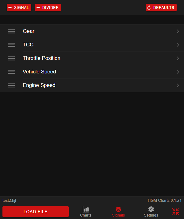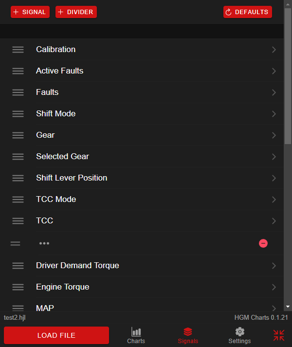 When you first load a log file, all of the signals captured in the log file are shown. You can turn on and off signals shown on the charts, and re-arrange any of them, by clicking on the “Signals” button. This view shows each signal along with the divider between each graphs. You can add signals or dividers using the buttons at the top, or move signals among the graphs by dragging the slider on the left side. Removing a divider joins two graphs together.