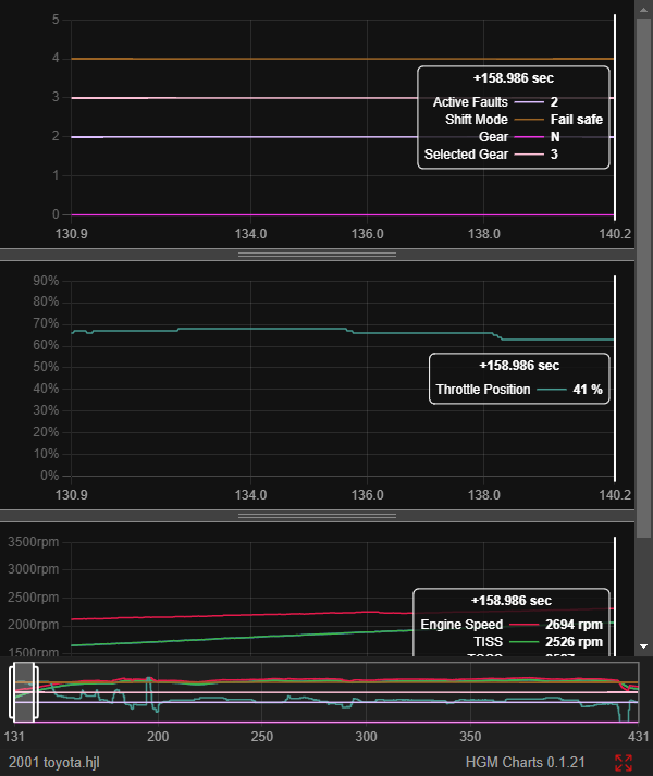 If you move two signals that have different types into the same chart, you will get a Y axis for each one. By default, if two signals have the same type, like % or RPM, then those signals will share a single Y axis in a chart. In the example below, five signals are selected and because there is no divider, only one graph is shown. There are four Y axes: one for RPM, one for vehicle speed, and one for gear and TCC.